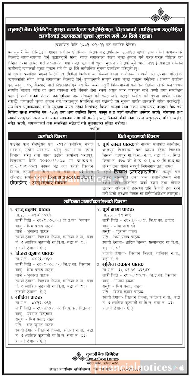 चितवनको तपसिलमा उल्लेखित ऋणीहरुलाई ऋणकर्जा चुक्ता भुक्तान गर्ने ३५ दिने सूचना