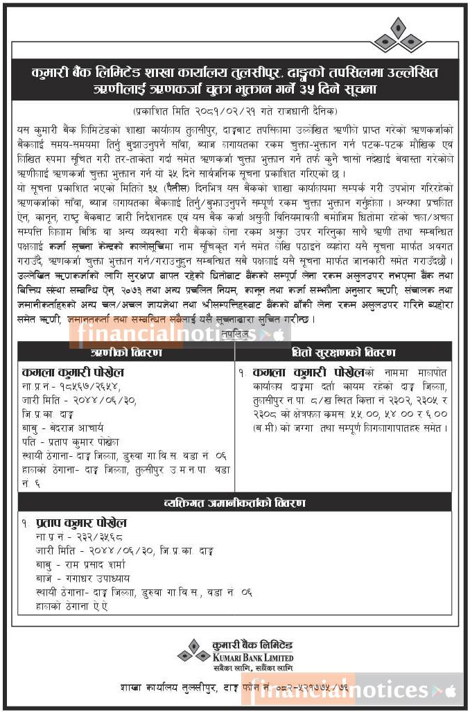 दाङ्गको तपसिलमा उल्लेखित ऋणीहरुलाई ऋणकर्जा चुक्ता भुक्तान गर्ने ३५ दिने सूचना