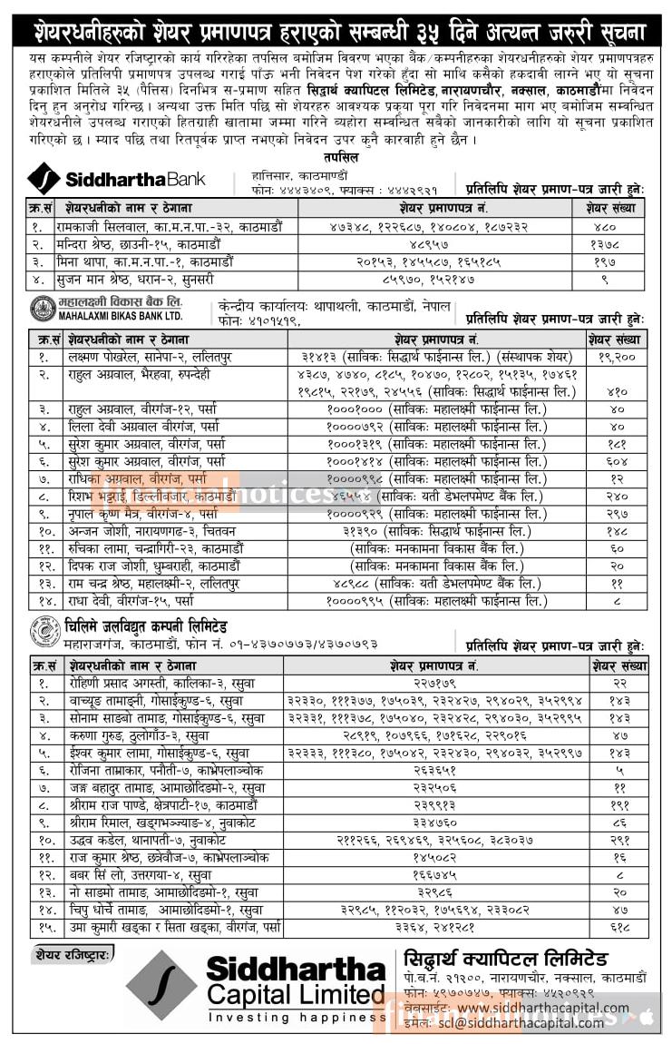 शेयरधनीहरुको शेयर प्रमाणपत्र हराएको सम्बन्धी ३५ दिने सूचना
