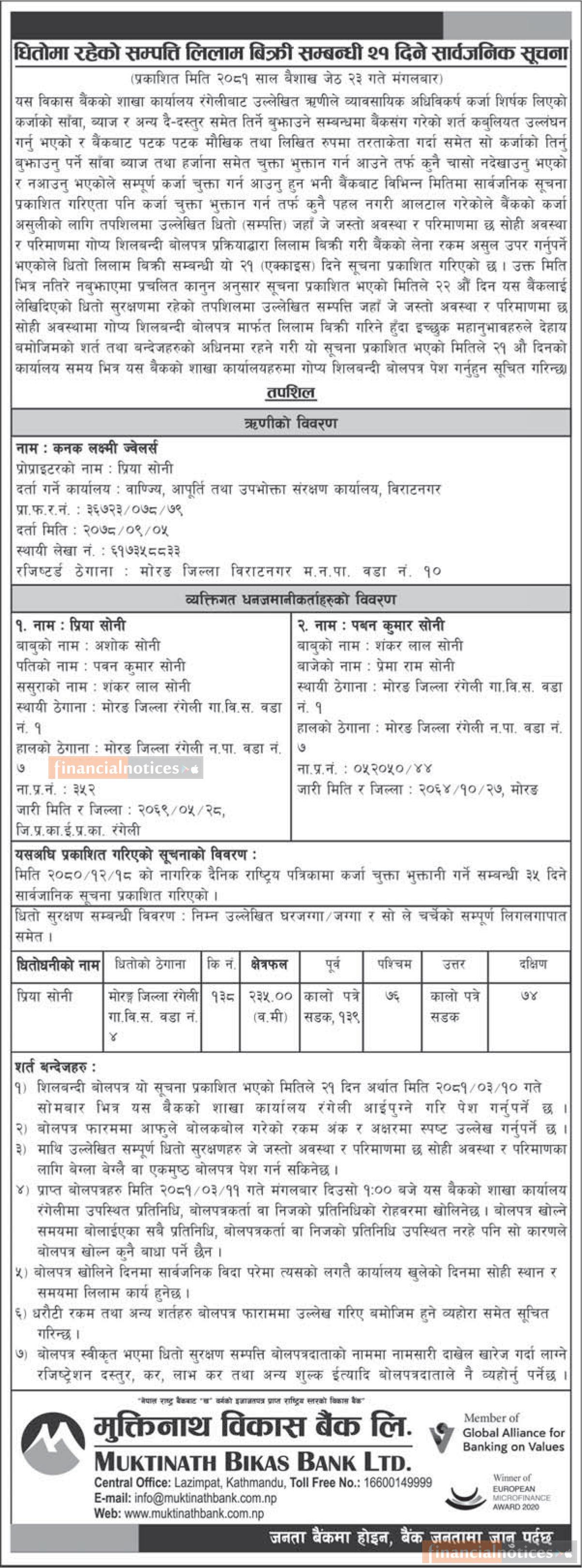 धितोमा रहेको सम्पत्ति लिलाम बिक्री सम्बन्धी २१ दिने सार्वजनिक सूचना