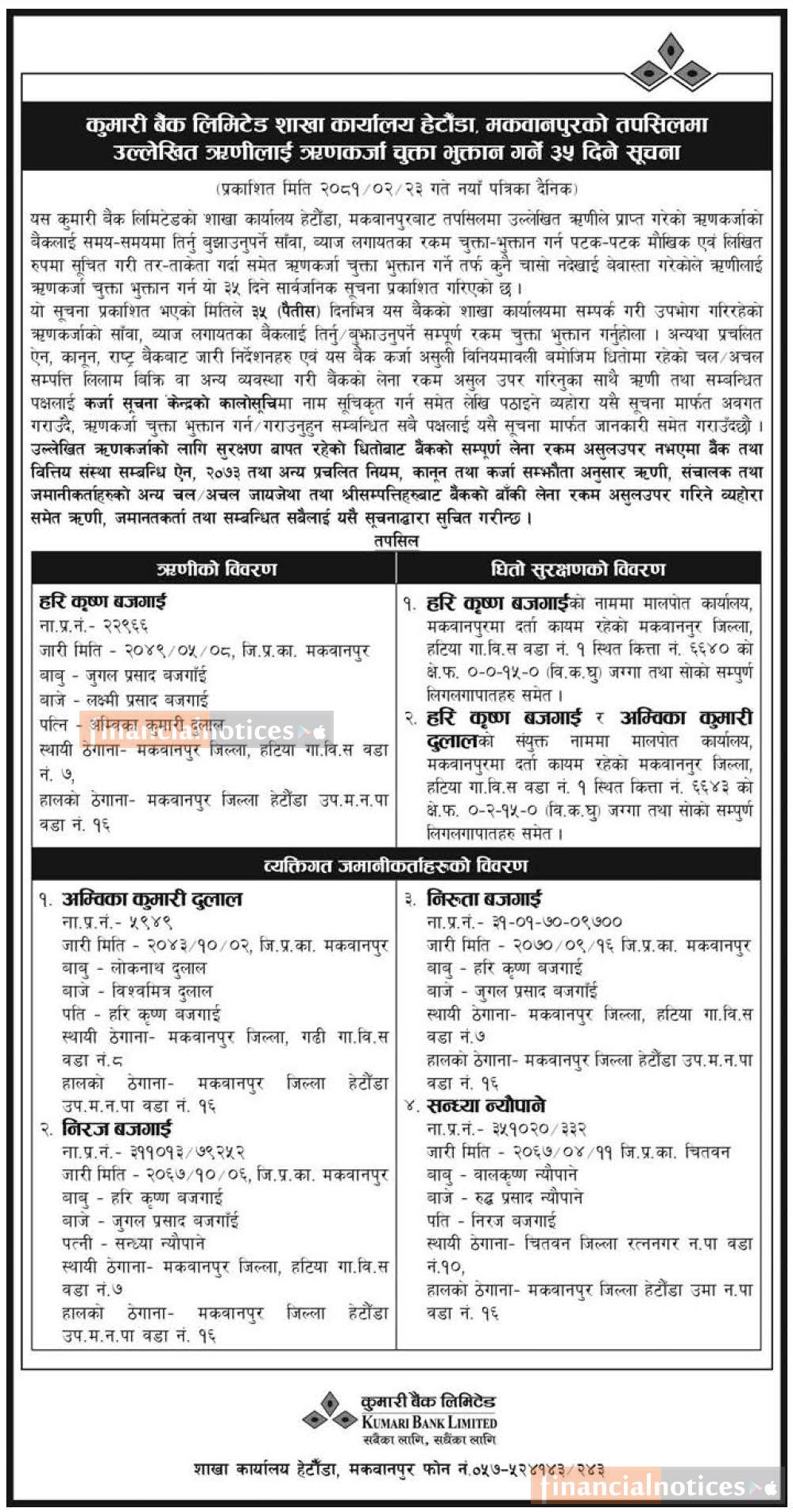 मकवानपुरको तपसिलमा उल्लेखित ऋणीहरुलाई ऋणकर्जा चुक्ता भुक्तान गर्ने ३५ दिने सूचना