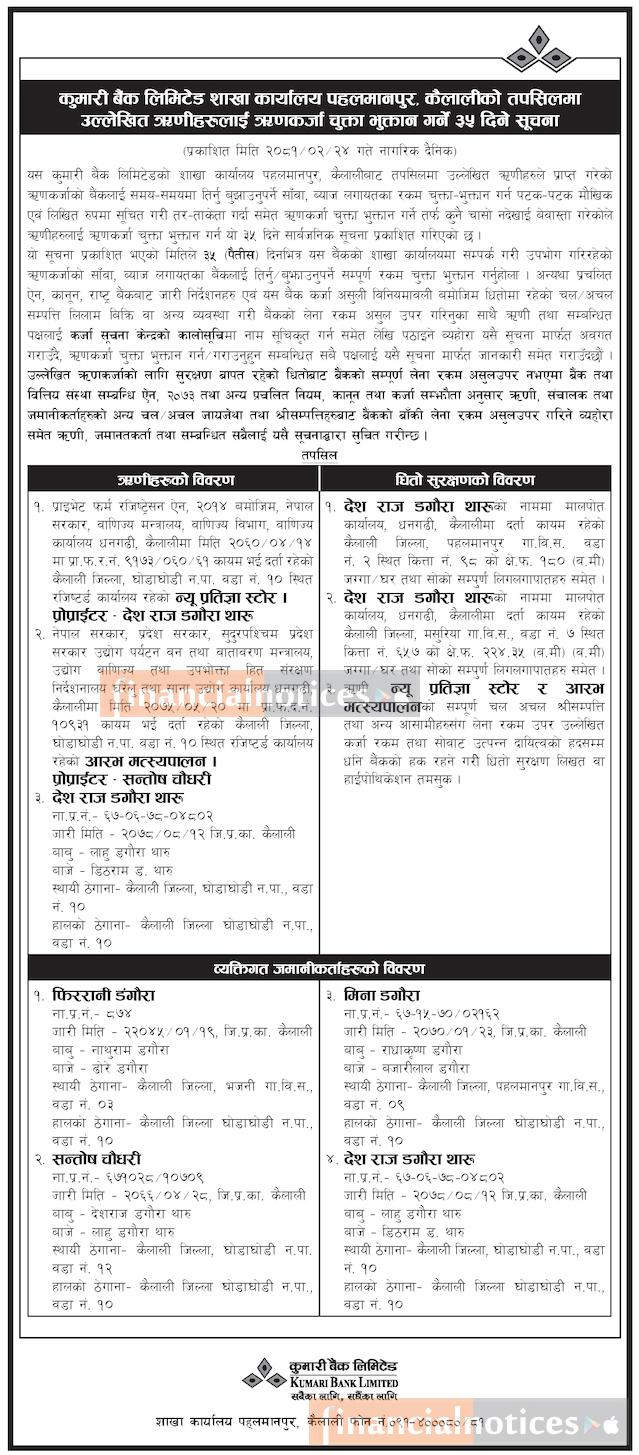 कैलालीको तपसिलमा उल्लेखित ऋणीहरुलाई ऋणकर्जा चुक्ता भुक्तान गर्ने ३५ दिने सूचना