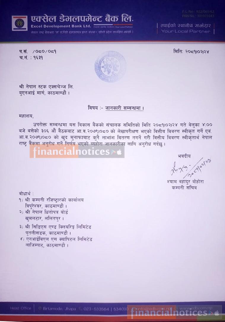 एक्सेल डेभलपमेन्ट बैंकले लाभांश वितरण नगर्ने बारे सूचना