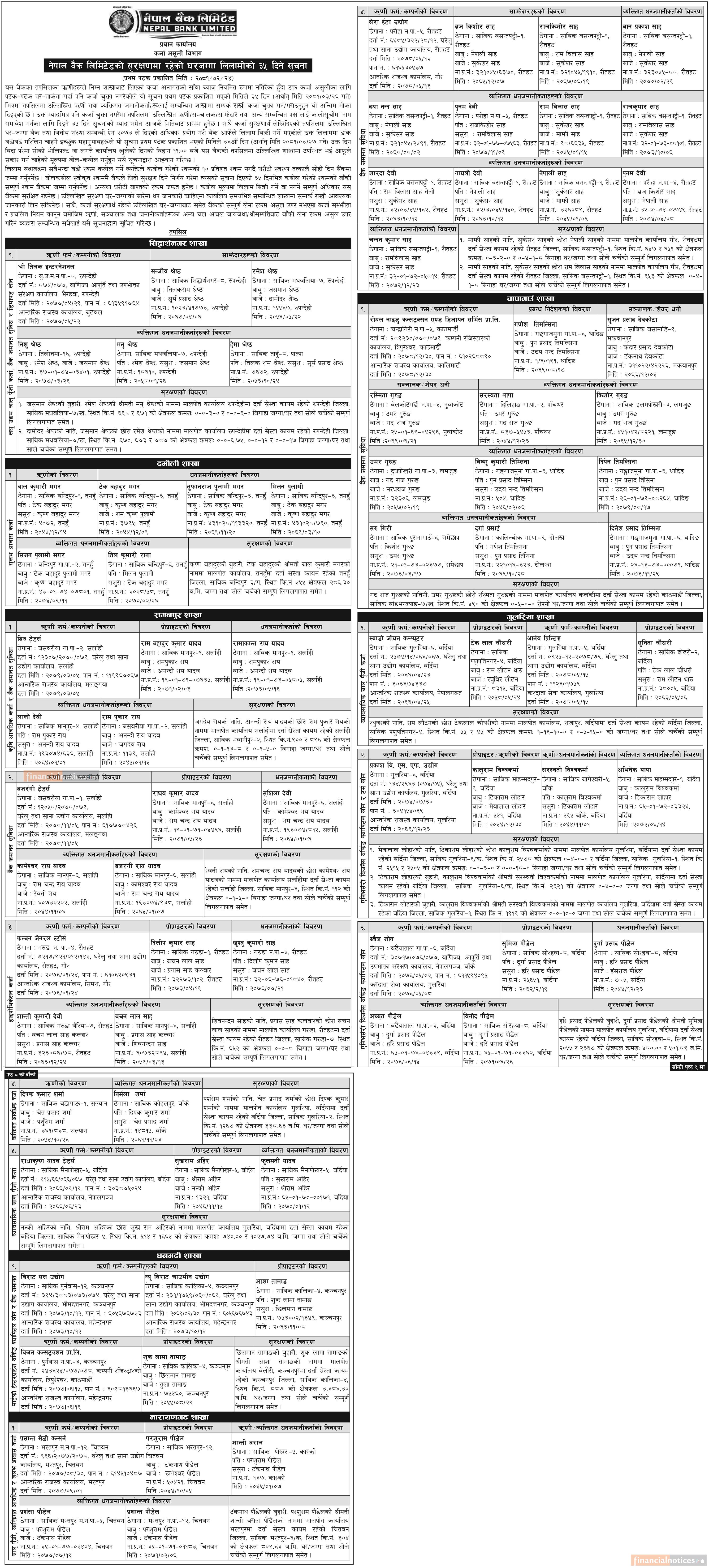 नेपाल बैंकको सुरक्षणमा रहेको घरजग्गा लिलामीको ३५ दिने सूचना