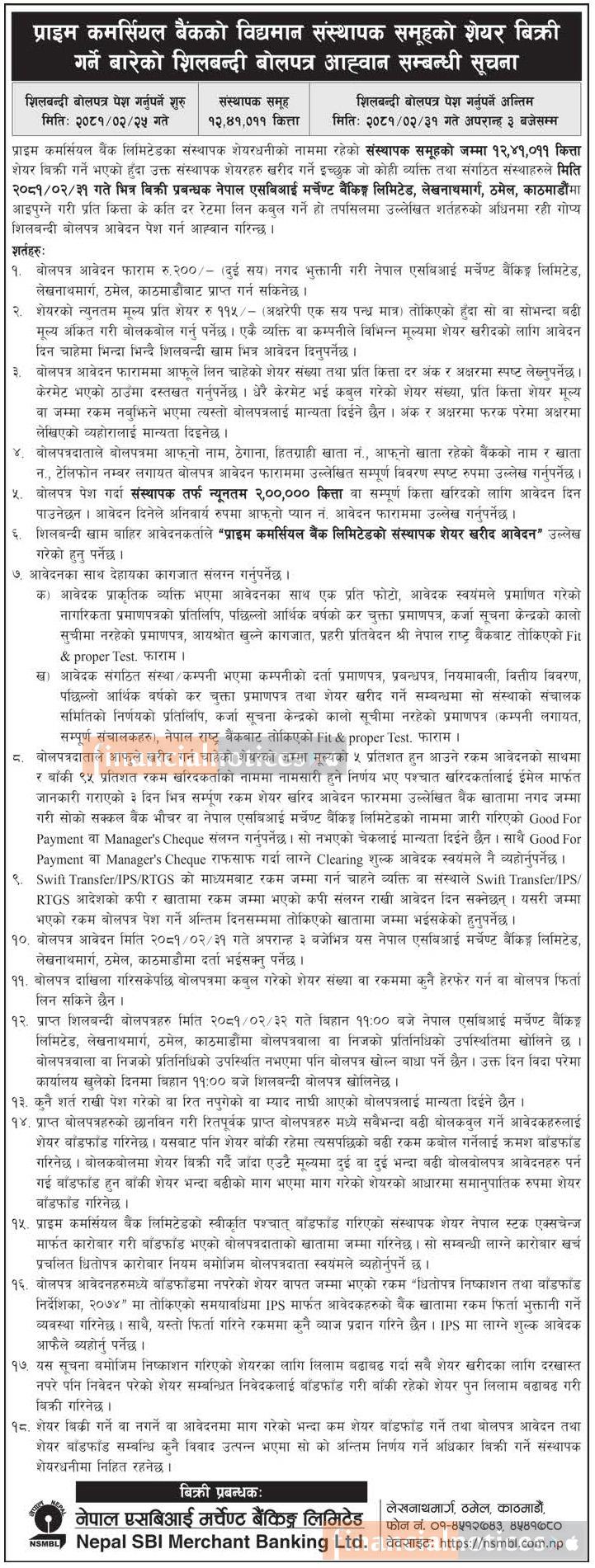 Notice Regarding Prime Bank is selling 12,41,011 units promoter shares in an auction