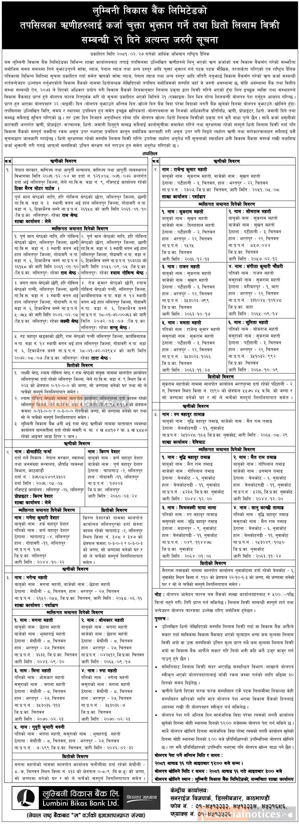 ऋणीहरुलाई कर्जा चुक्ता भुक्तान गर्ने तथा धितो लिलाम बिक्री सम्बन्धी २१ दिने अत्यन्त जरुरी सूचना