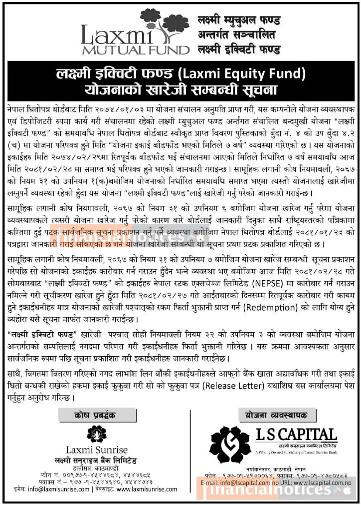 Laxmi Equity Fund योजनाको खारेजी सम्बन्धी सूचना