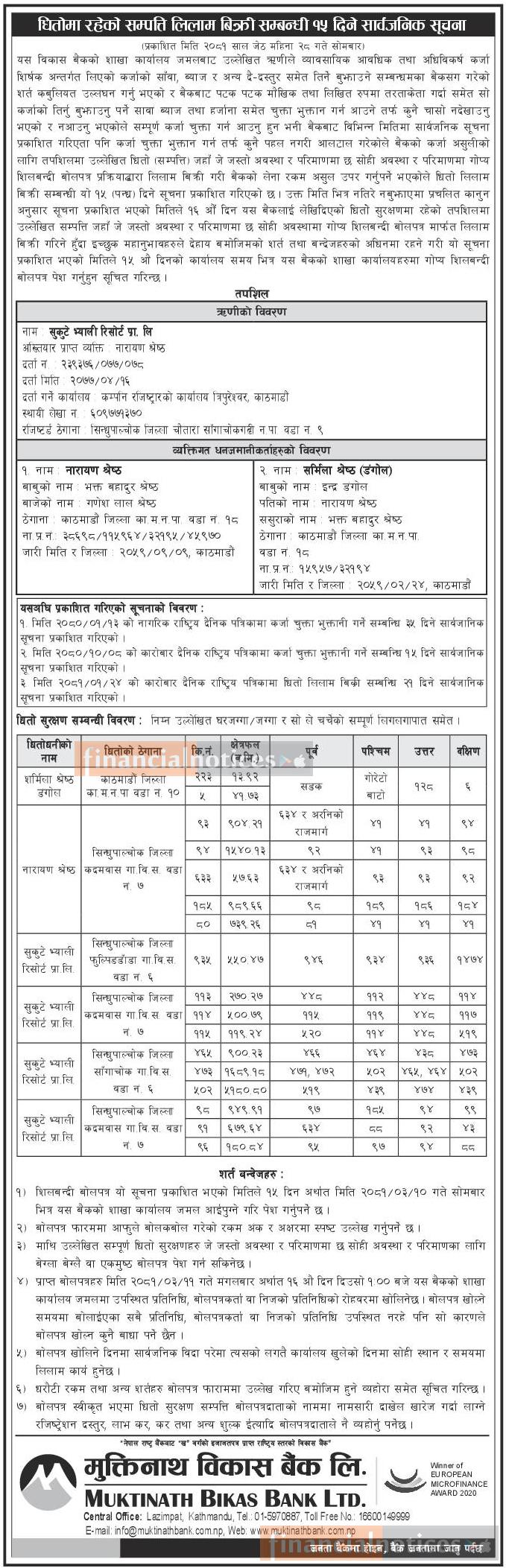 धितोमा रहेको सम्पत्ति लिलाम बिक्री सम्बन्धी १५ दिने सार्वजनिक सूचना