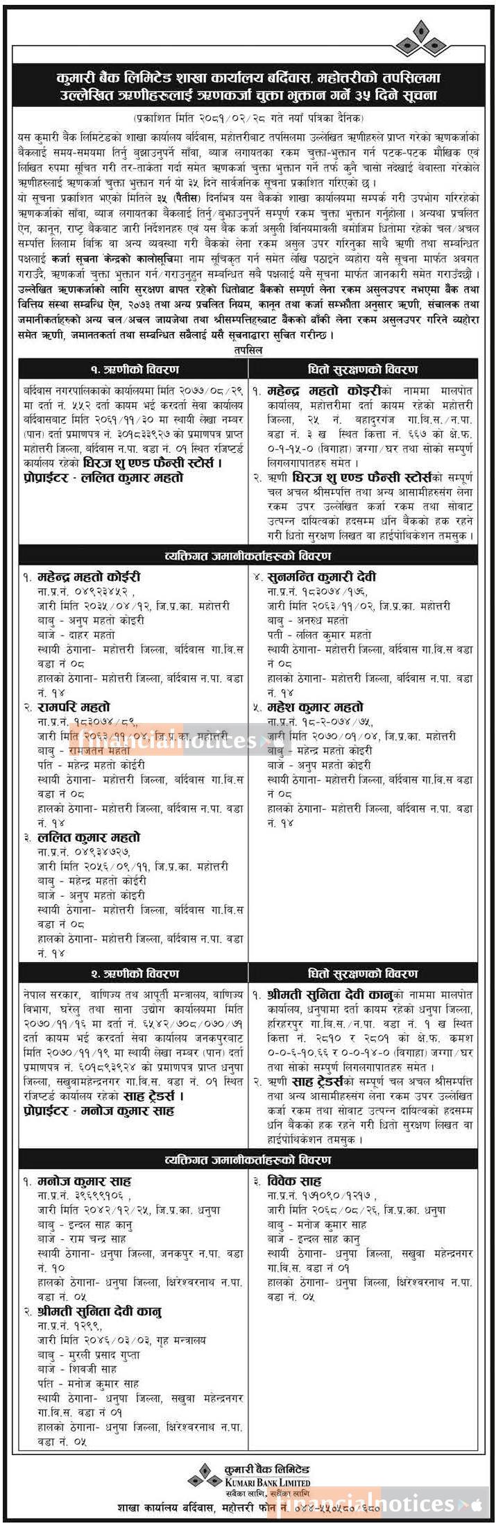 महोत्तरीको तपसिलमा उल्लेखित ऋणीहरुलाई ऋणकर्जा चुक्ता भुक्तान गर्ने ३५ दिने सूचना
