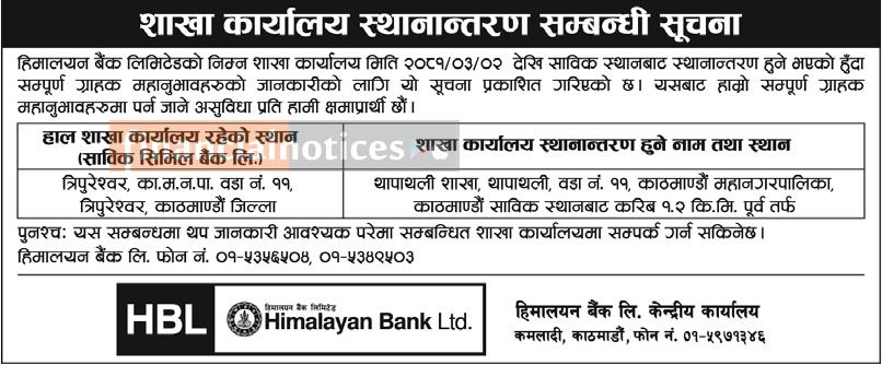 हिमालयन बैंकको शाखा कार्यालय स्थानान्तरण सम्बन्धी सूचना