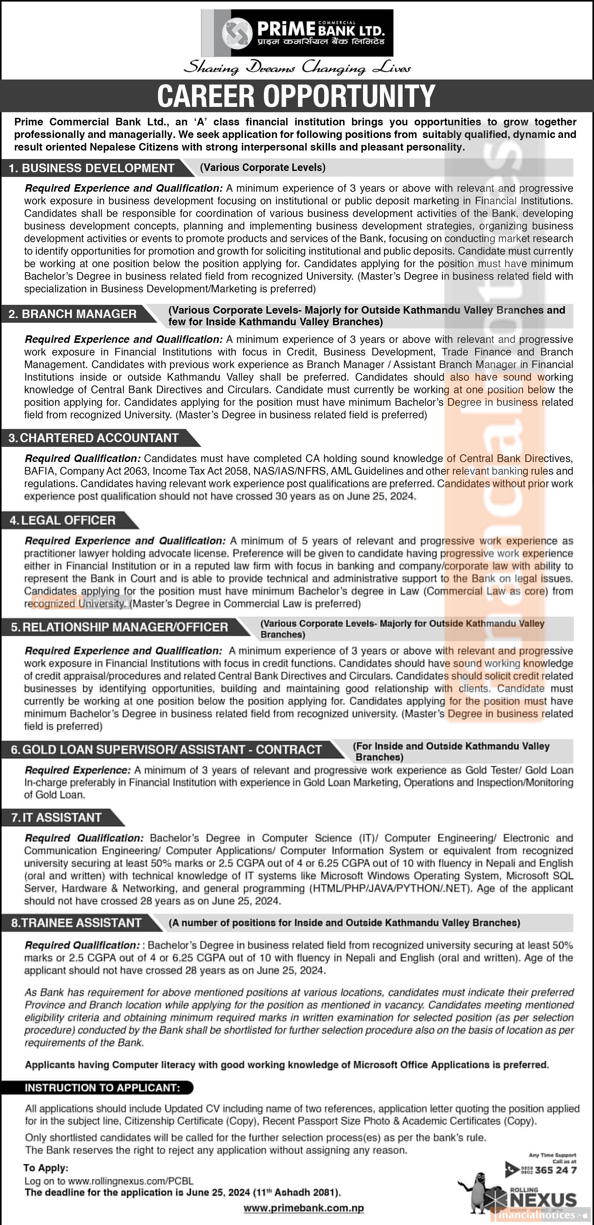 Kathmandu, Nepal – Prime Commercial Bank Ltd., an ‘A’ class financial institution, invites applications from suitably qualified, dynamic, and result-oriented Nepalese citizens with strong IT skills and pleasant personalities for various positions. The bank seeks to fill roles across different corporate levels and branches, with a focus on enhancing its business development, credit functions, legal support, IT, and overall branch management.