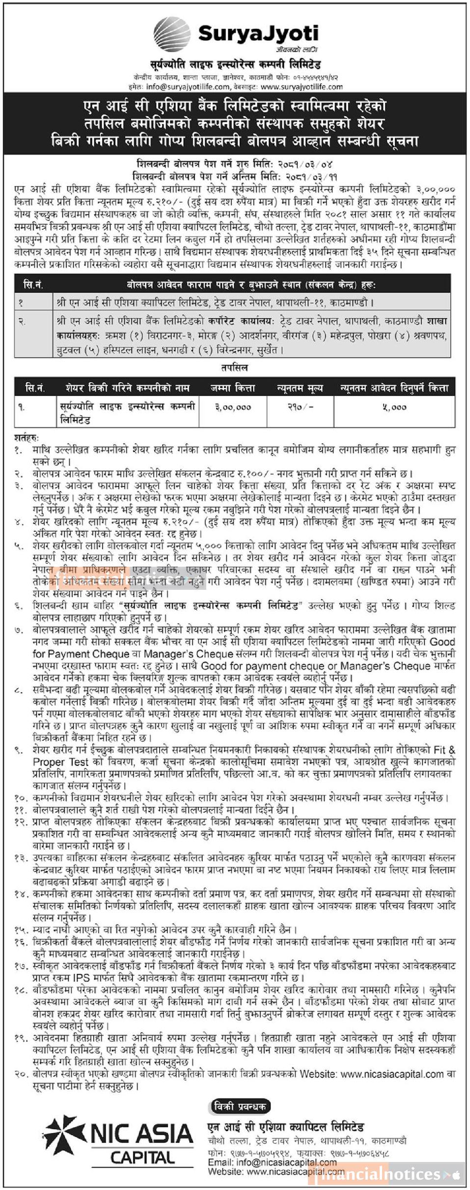 सूर्यज्योति लाइफ इन्सुरेन्सको ३ लाख कित्ता संस्थापक सेयर लिलामी बिक्री खुला बारे सूचना