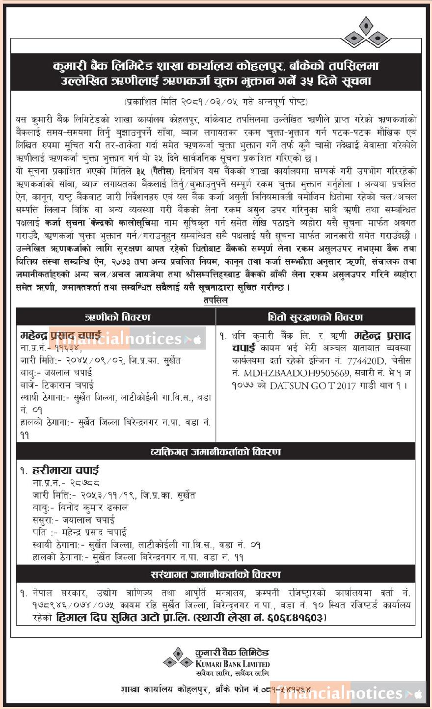 Published by Kumari Bank Ltd (KBL) on 2081-3-5