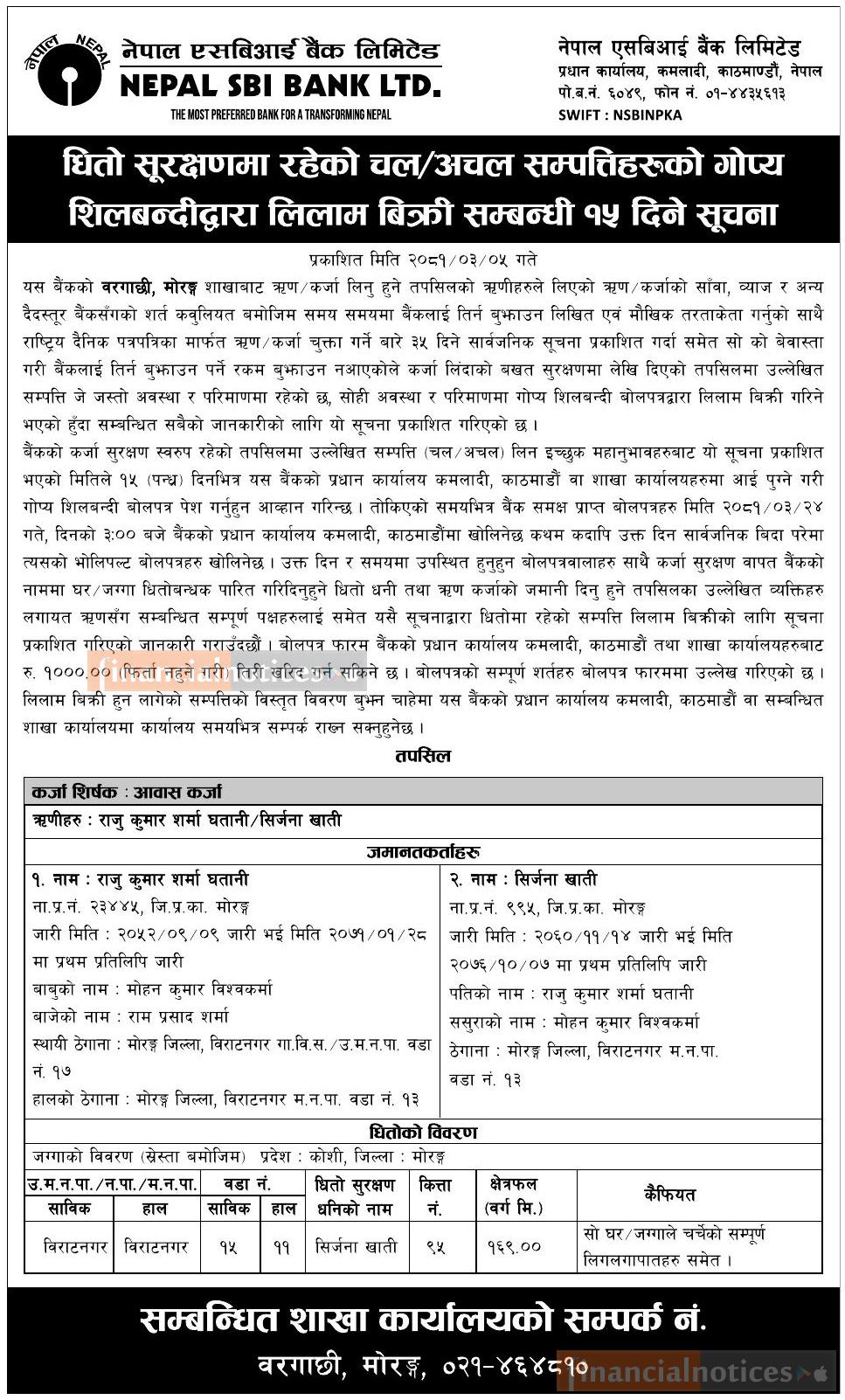 Nepal SBI Bank: Auction Notice for Non-Banking Assets at Geta-2, Kailali
