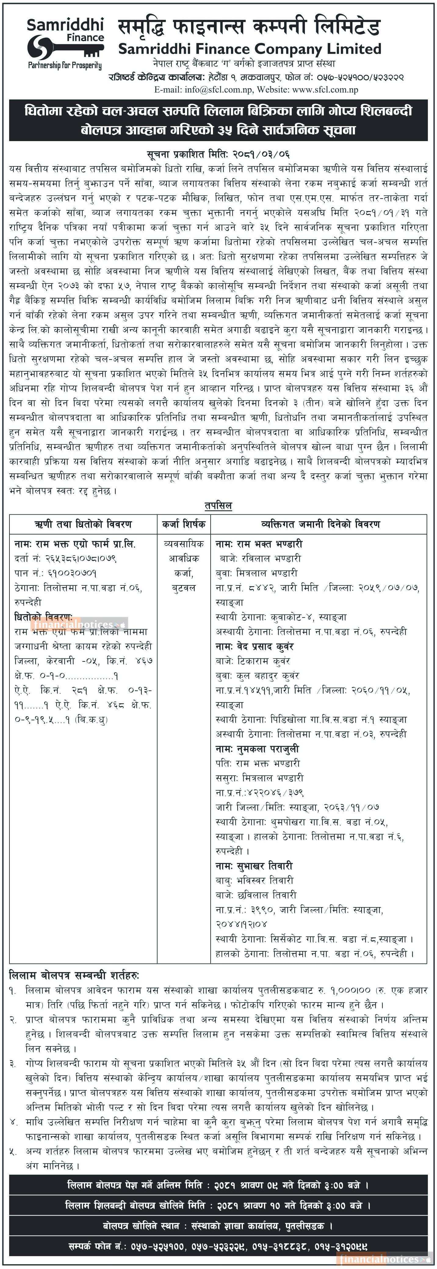 धितोमा रहेको चल/अचल सम्पत्ति लिलाम बिक्री गर्न गोप्य शिलबन्दी बोलपत्र आव्हान सम्बन्धी २१ दिने सूचना