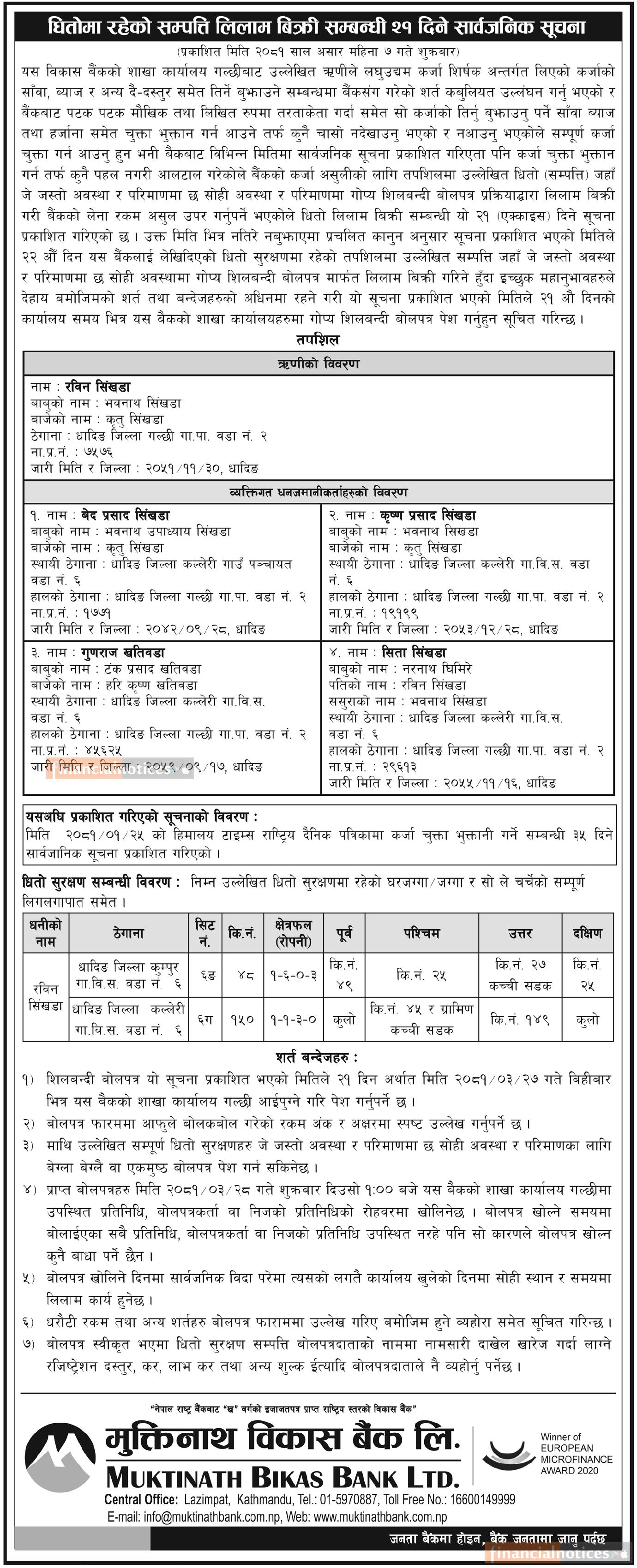 धितोमा रहेको सम्पत्ति लिलाम बिक्री सम्बन्धी २१ दिने सार्वजनिक सूचना