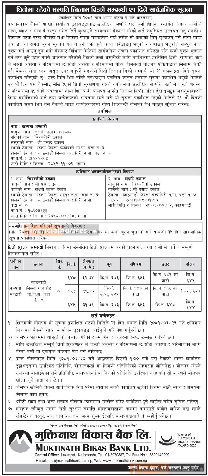 धितोमा रहेको सम्पत्ति लिलाम बिक्री सम्बन्धी २१ दिने सार्वजनिक सूचना