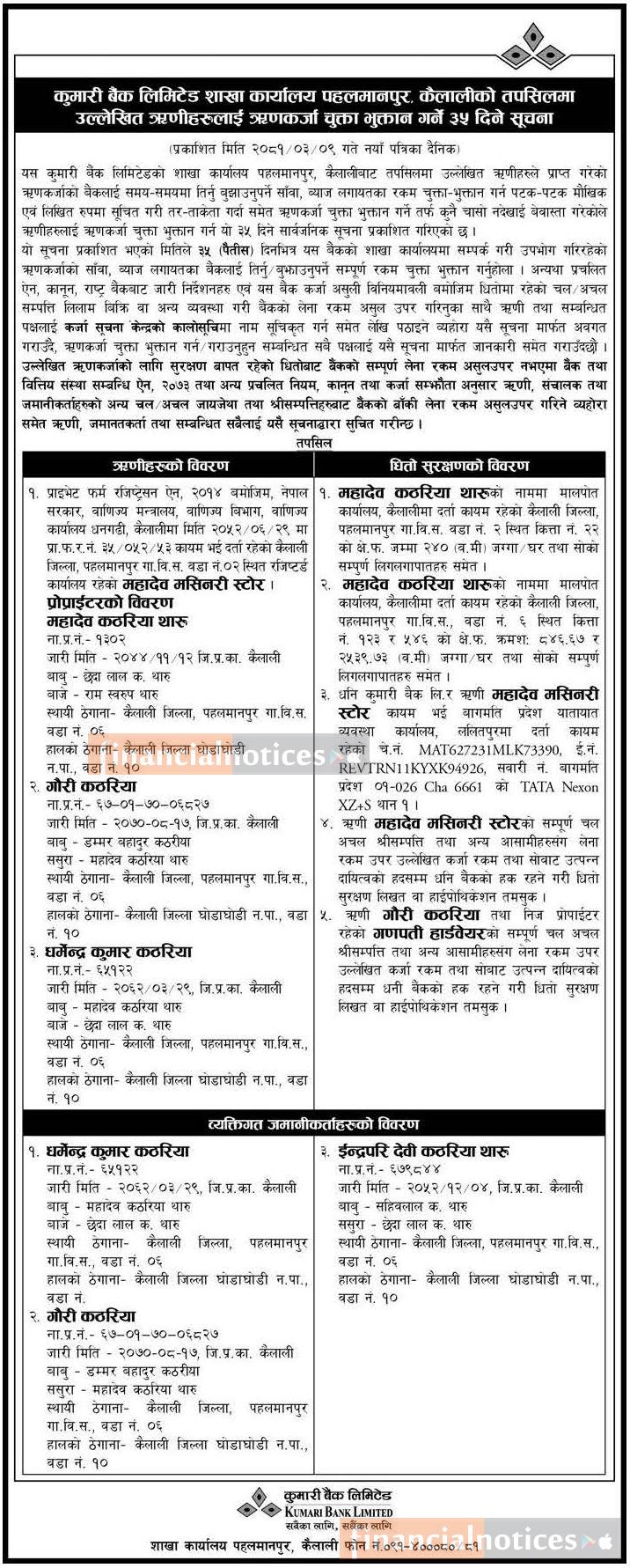 कैलालीको तपसिलमा उल्लेखित ऋणीहरुलाई ऋणकर्जा चुक्ता भुक्तान गर्ने ३५ दिने सूचना