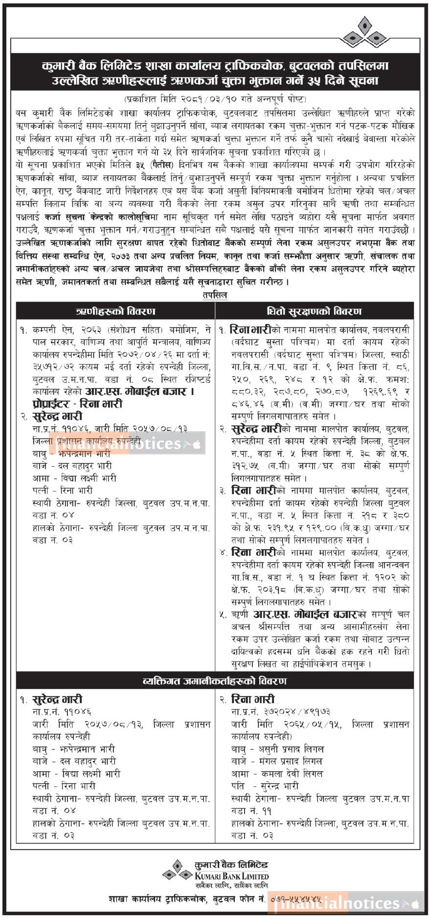 बुटवलको तपसिलमा उल्लेखित ऋणीहरुलाई ऋणकर्जा चुक्ता भुक्तान गर्ने ३५ दिने सूचना