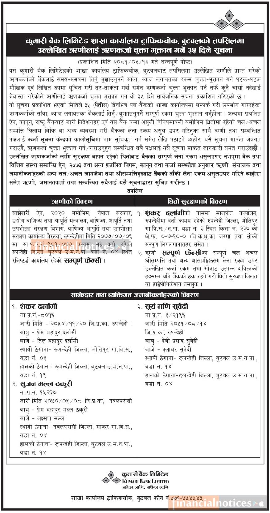 बुटवलको तपसिलमा उल्लेखित ऋणीहरुलाई ऋणकर्जा चुक्ता भुक्तान गर्ने ३५ दिने सूचना