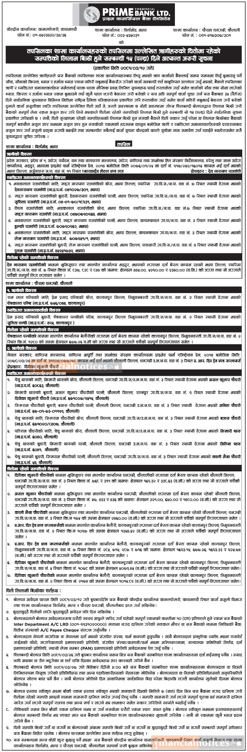 ऋणीहरुको धितोमा रहेको सम्पत्तिको लिलाम बिक्री हुने सम्बन्धी १५ दिने सूचना