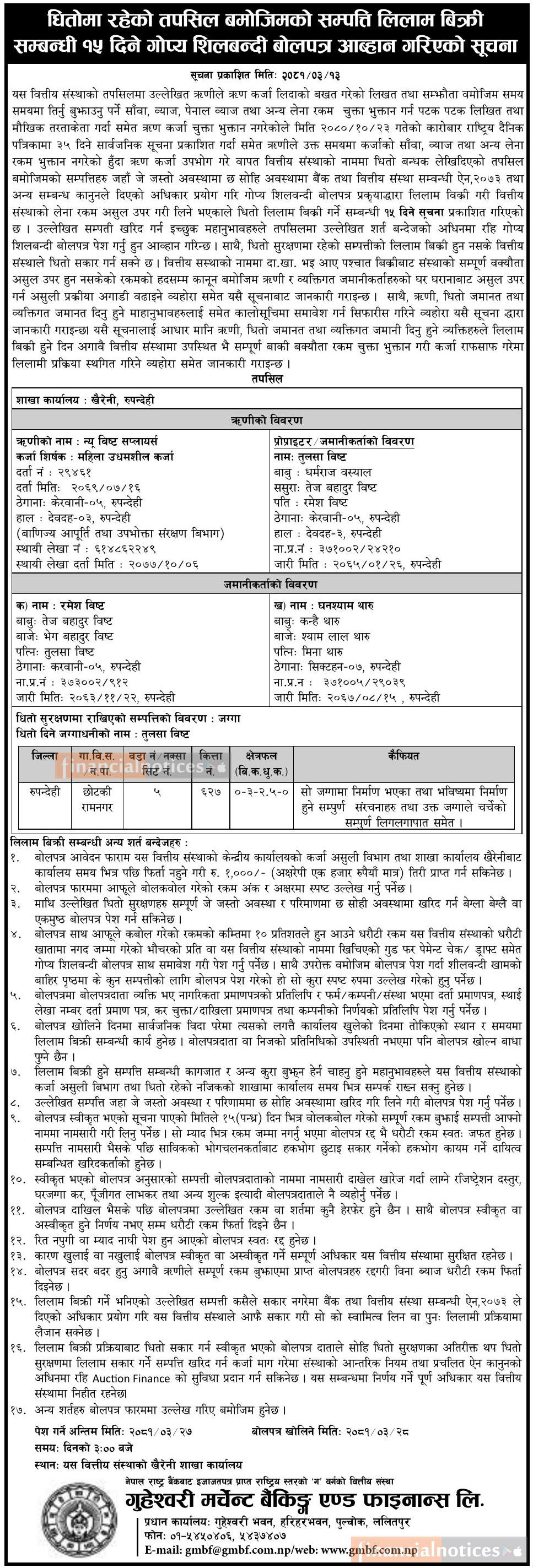 धितोमा रहेको तपसिल बमोजिमको सम्पत्ति लिलाम बिक्रीको १५ दिने सूचना