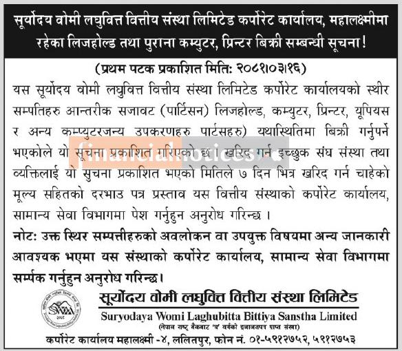 लघुवित्तको पुराना कम्युटर, प्रिन्टर बिक्री सम्बन्धी सूचना