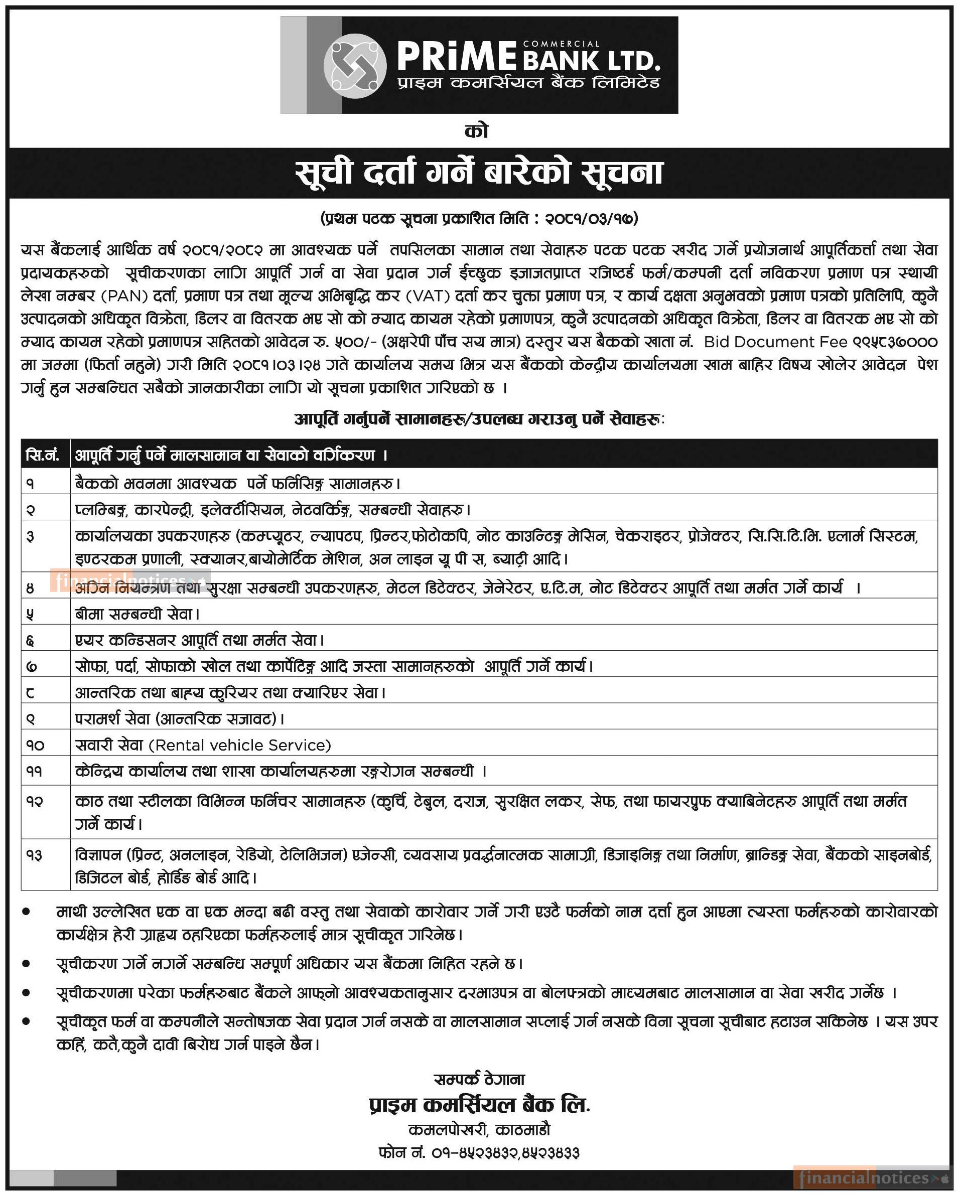 बैंकलाई आवश्यक पर्ने वस्तु तथा सेवा आपुर्ति गर्ने कम्पनीको सूचीकरण गर्ने बारे सूचना
