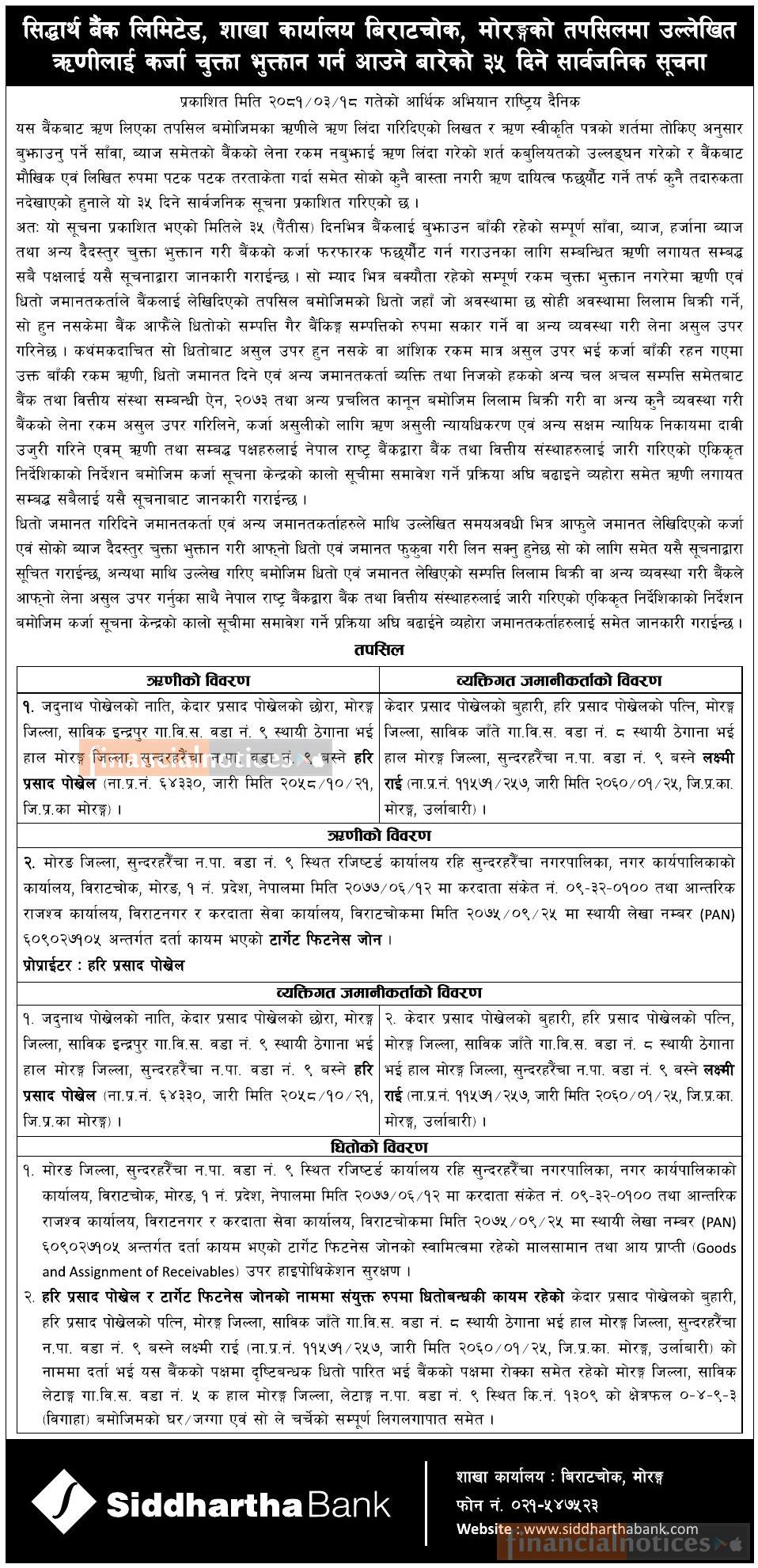 मोरङ्गको तपसिलमा उल्लेखित ऋणीहरुलाई कर्जा चुक्ता भुक्तान गर्न आउने बारेको ३५ दिने सूचना