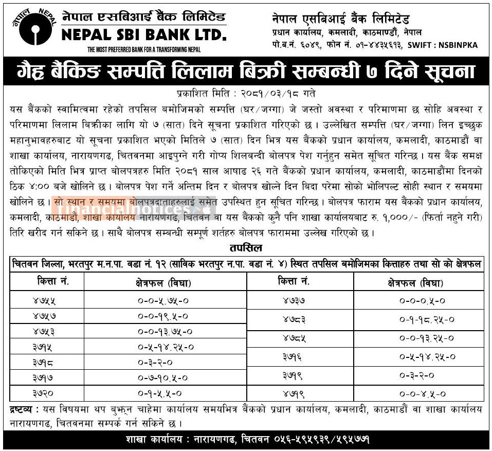Nepal SBI Bank: Auction Notice for Non-Banking Assets at Geta-2, Kailali
