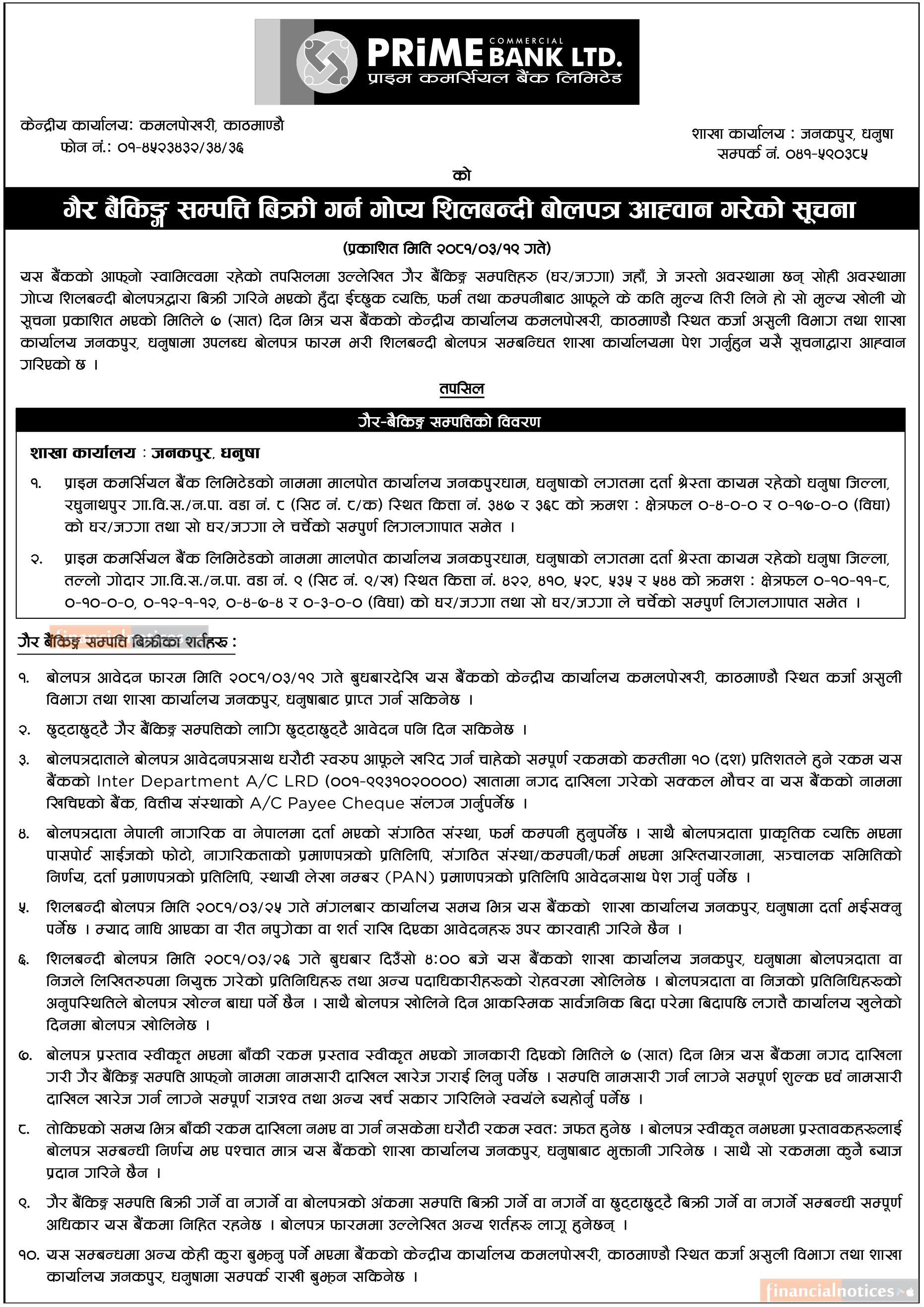 गैह्र बैंकिङ्ग सम्पत्ति बिक्री गर्न गोप्य शिलबन्दी बोलपत्र आव्हान गरेको सूचना