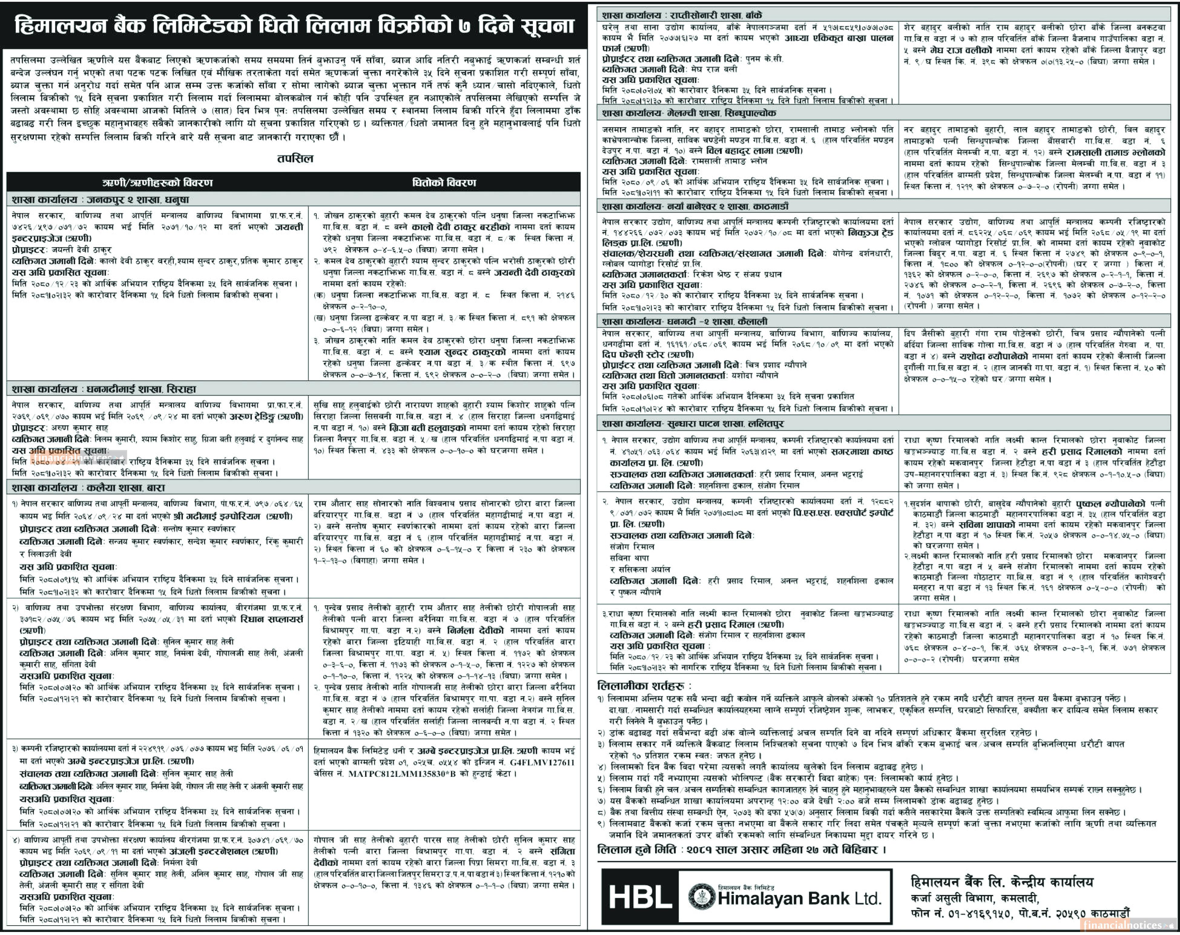 हिमालयन बैंकको धितो लिलाम बिक्रीको ७ दिने सूचना