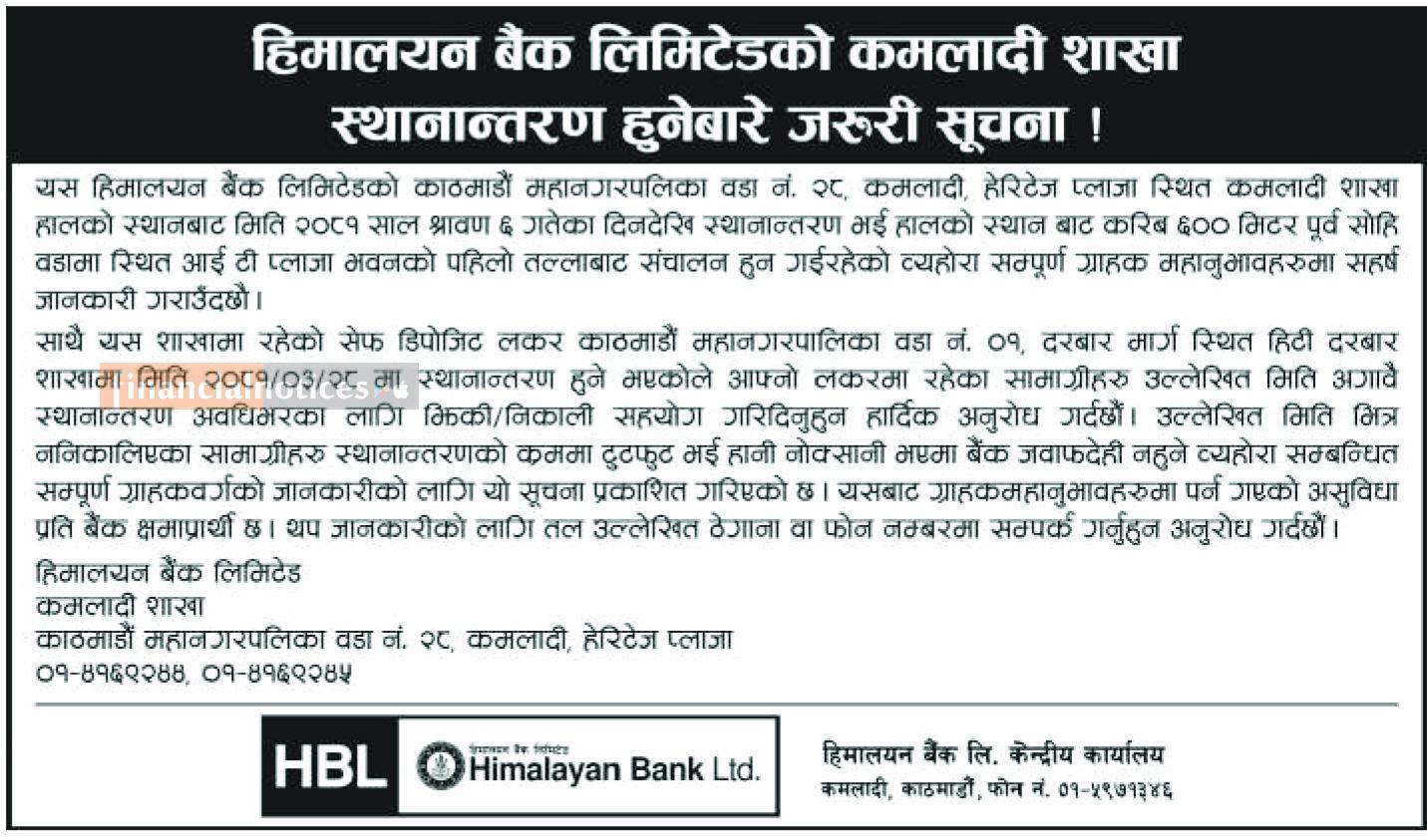 हिमालयन बैंकको शाखा स्थानान्तरण सम्बन्धी सूचना