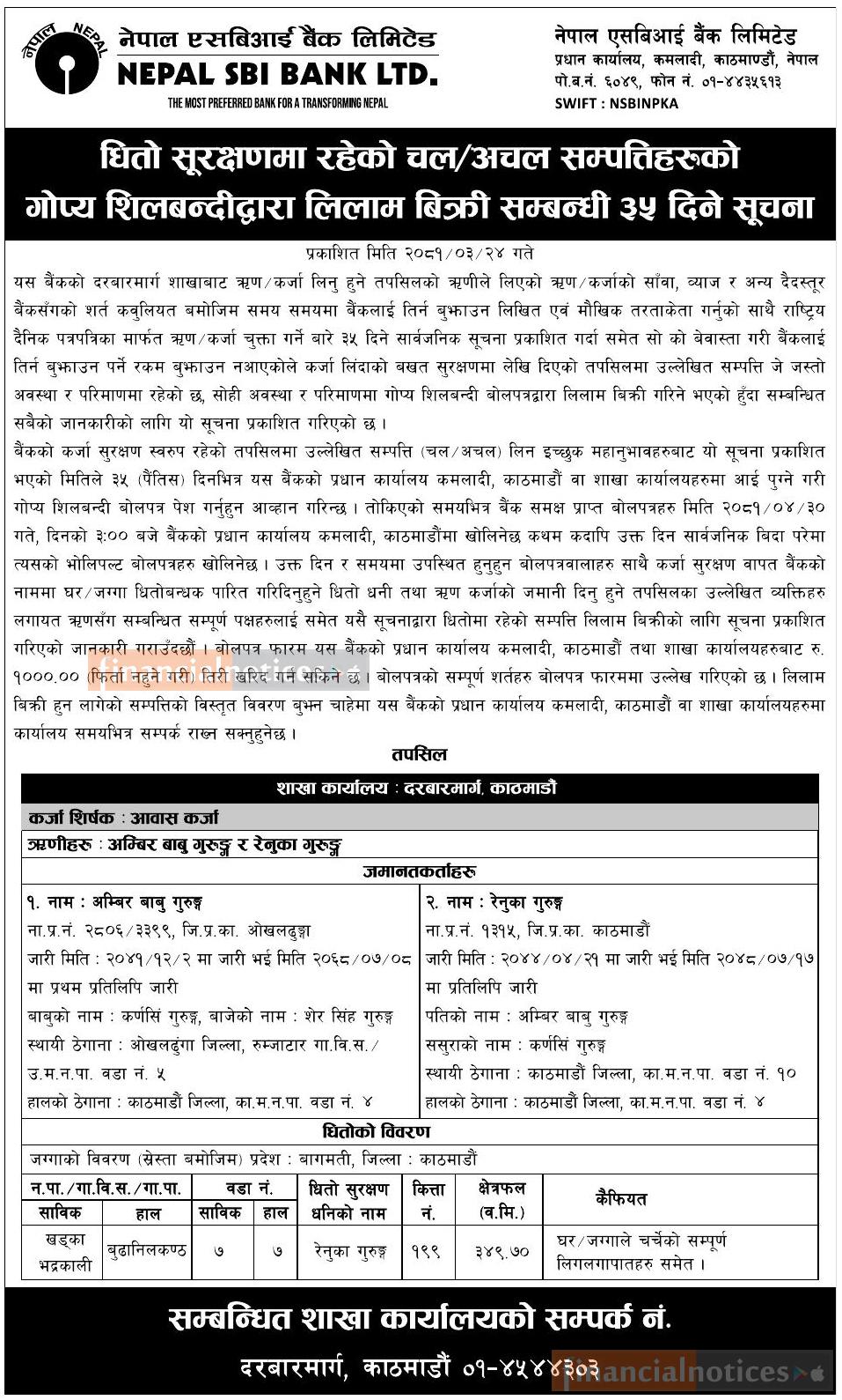 Nepal SBI Bank: Auction Notice for Non-Banking Assets at Geta-2, Kailali