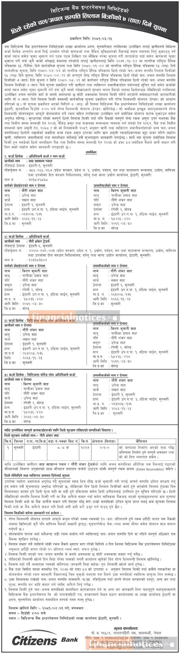धितो रहेको चल र अचल सम्पत्ति लिलाम बिक्रीको ७ दिने सूचना