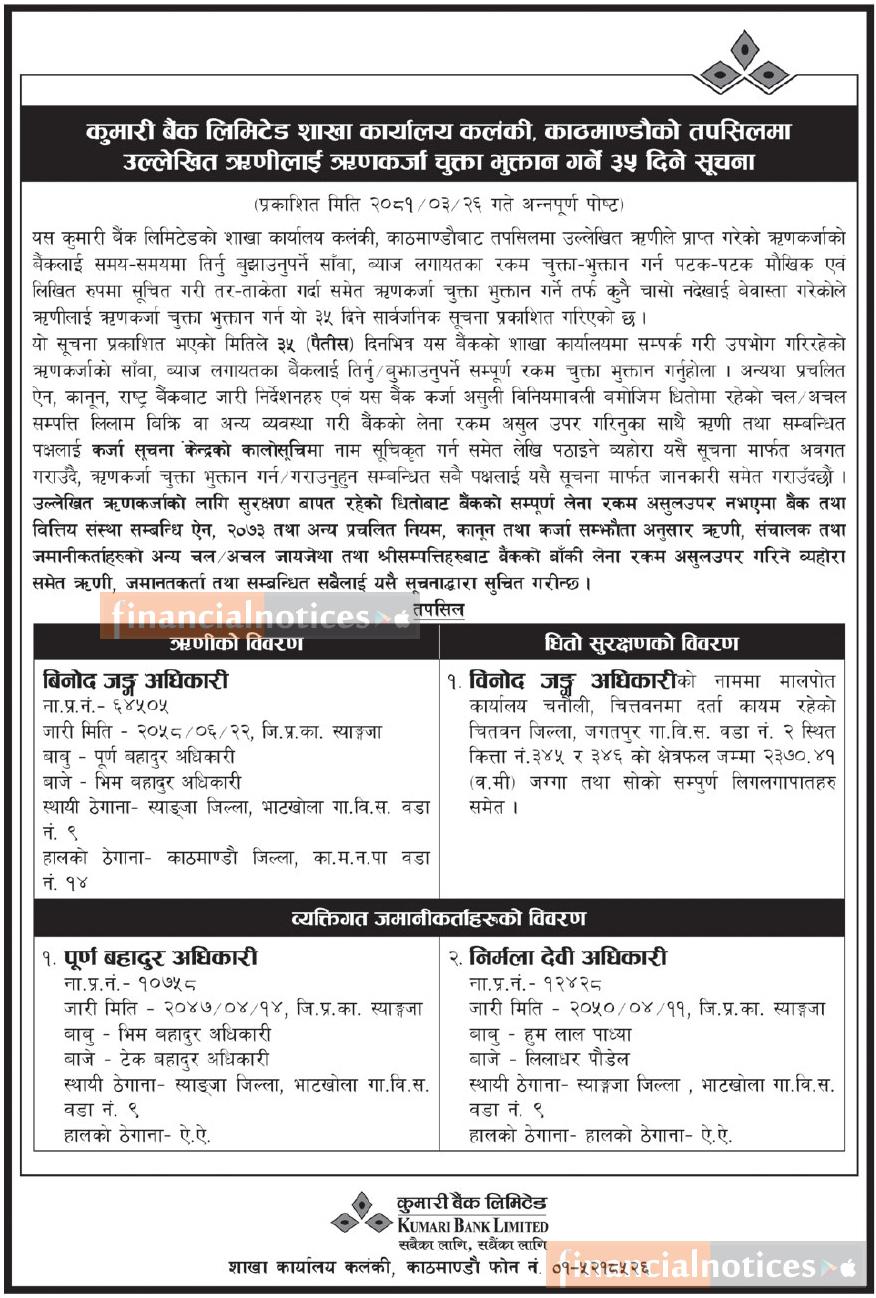 काठमाडौँको तपसिलमा उल्लेखित ऋणीहरुलाई ऋणकर्जा चुक्ता भुक्तान गर्ने ३५ दिने सूचना