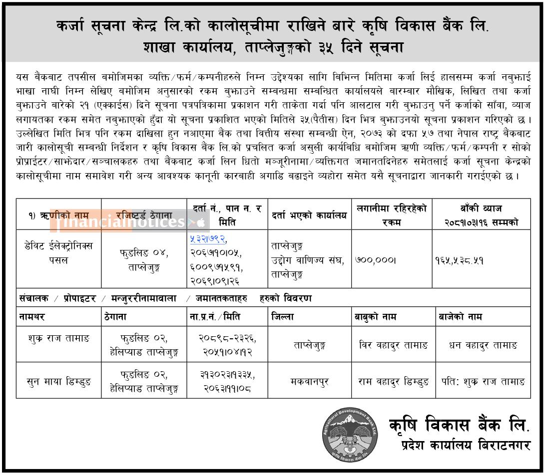 कालो सूचीमा राखिनेबारे कृषि विकास बैंक ताप्लेजुङ्ग शाखाको ३५ दिने सूचना
