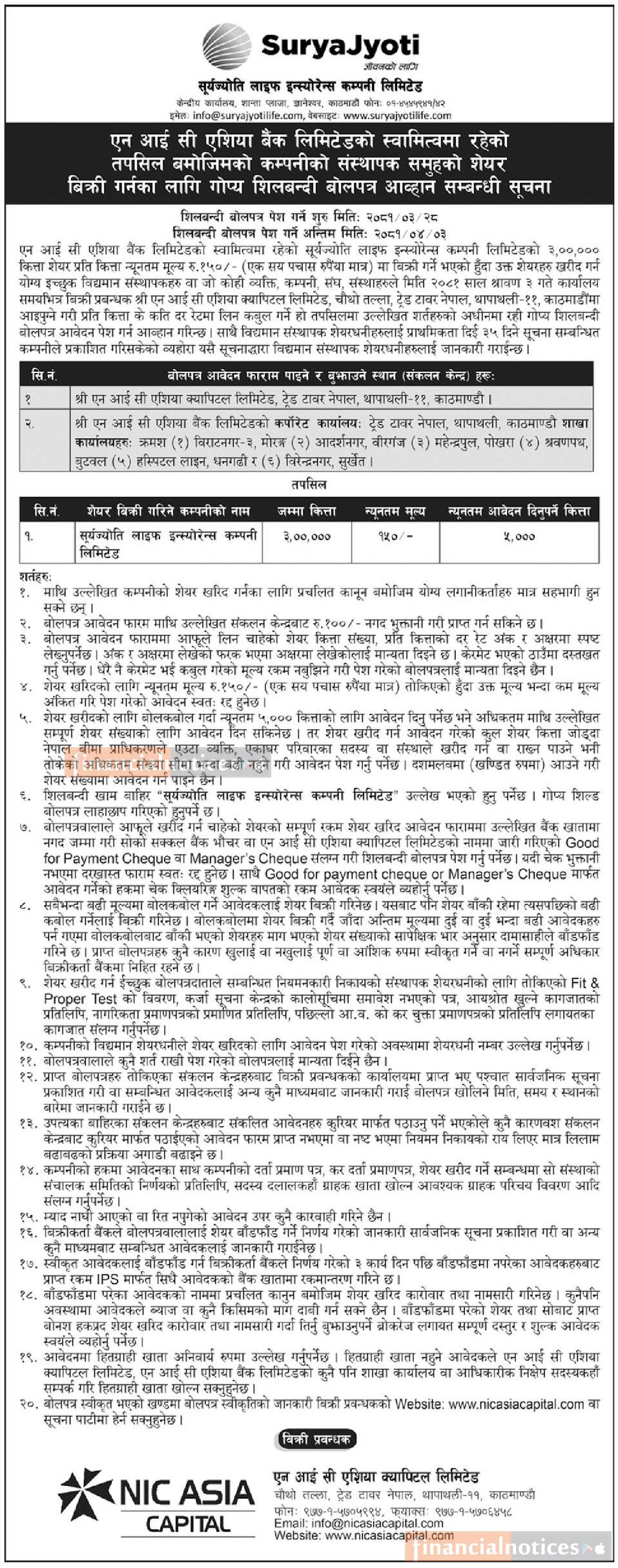 सूर्यज्योति लाइफ इन्सुरेन्सको ३ लाख कित्ता संस्थापक सेयर लिलामी बिक्री खुला बारे सूचना