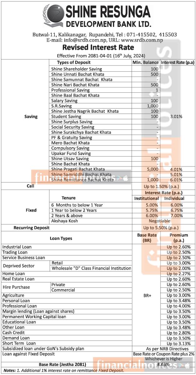 शाइन रेसुङ्गा डेभलपमेण्ट बैंकको नयाँ ब्याजदर सार्वजानिक सम्बन्धी सूचना