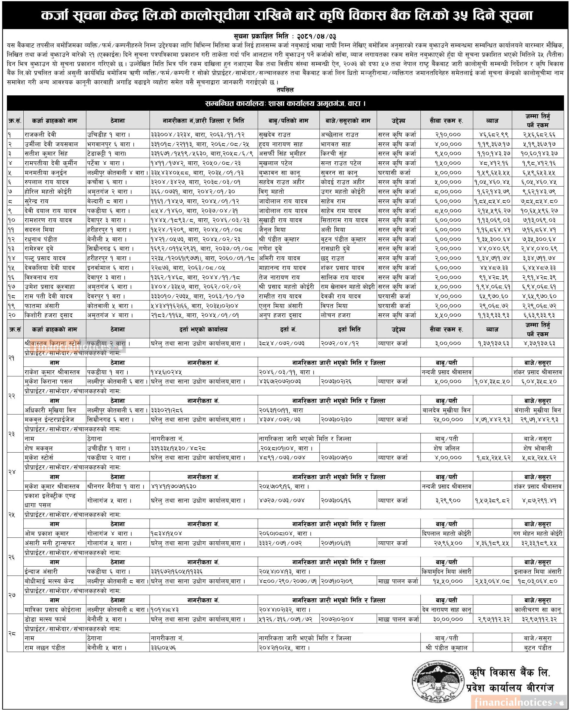 कर्जा सूचना केन्द्रको कालोसूचीमा राखिनेबारे कृषि विकास बैंकको सूचना -
