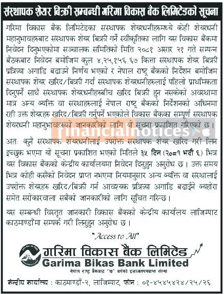 संस्थापक शेयर बिक्री सम्बन्धी गरिमा विकास बैंकको सूचना
