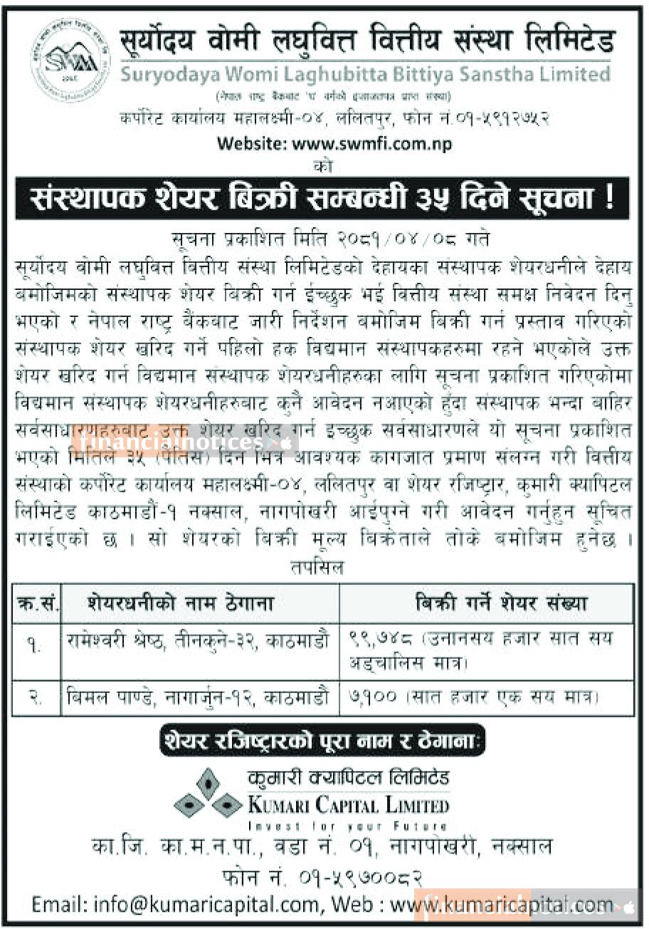 संस्थापक शेयर बिक्री सम्बन्धी ३५ दिने सूचना -