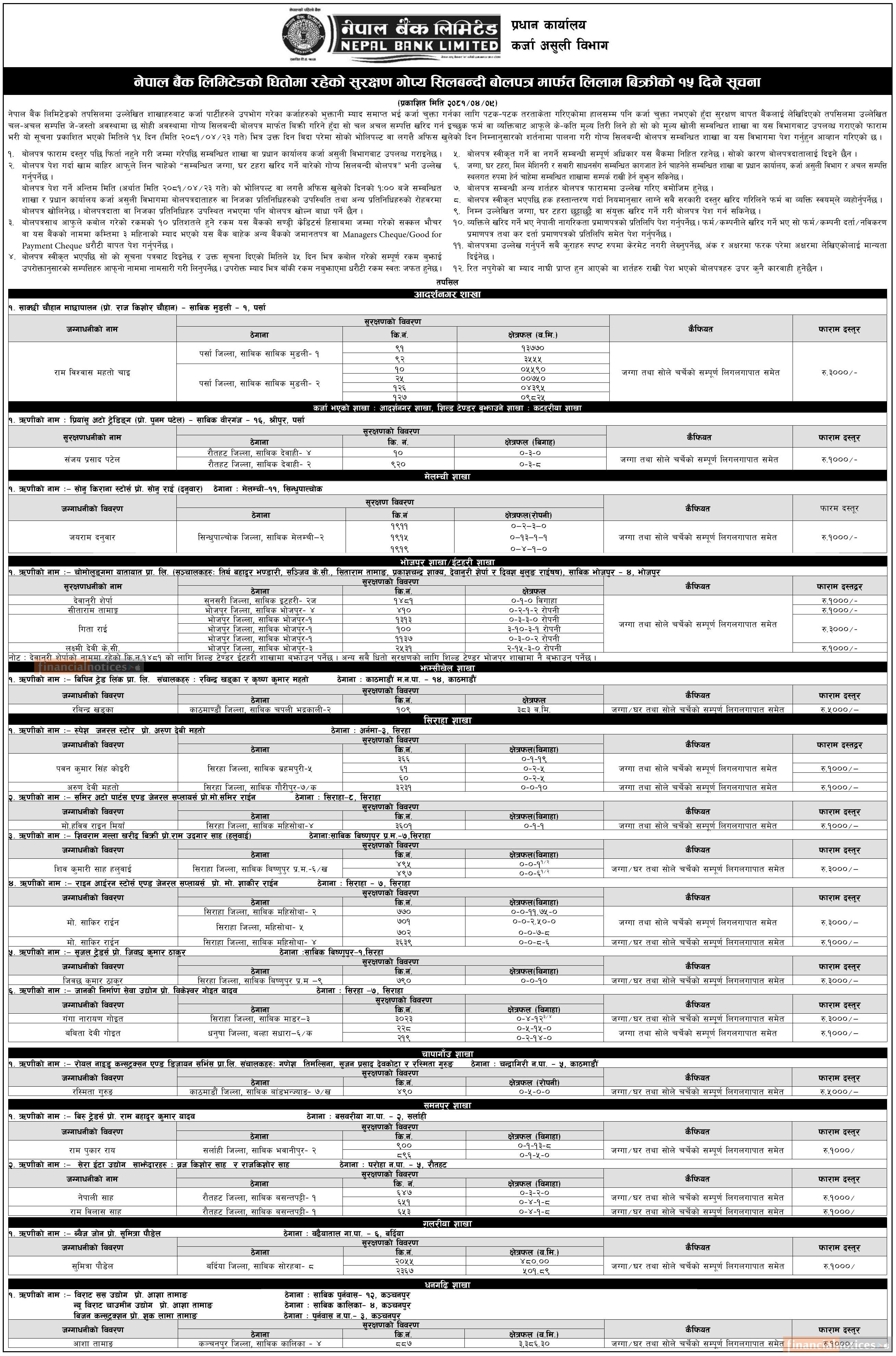 नेपाल बैंकको धितोमा रहेको सुरक्षण गोप्य शिलबन्दी बोलपत्र मार्फत् लिलामी बिक्रीको १५ दिने सूचना