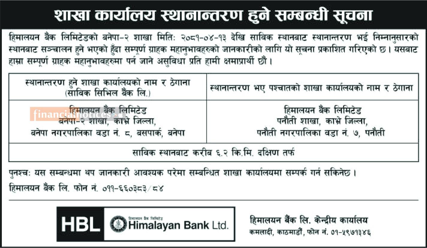 हिमालयन बैंकको शाखा स्थानान्तरण सम्बन्धी सूचना