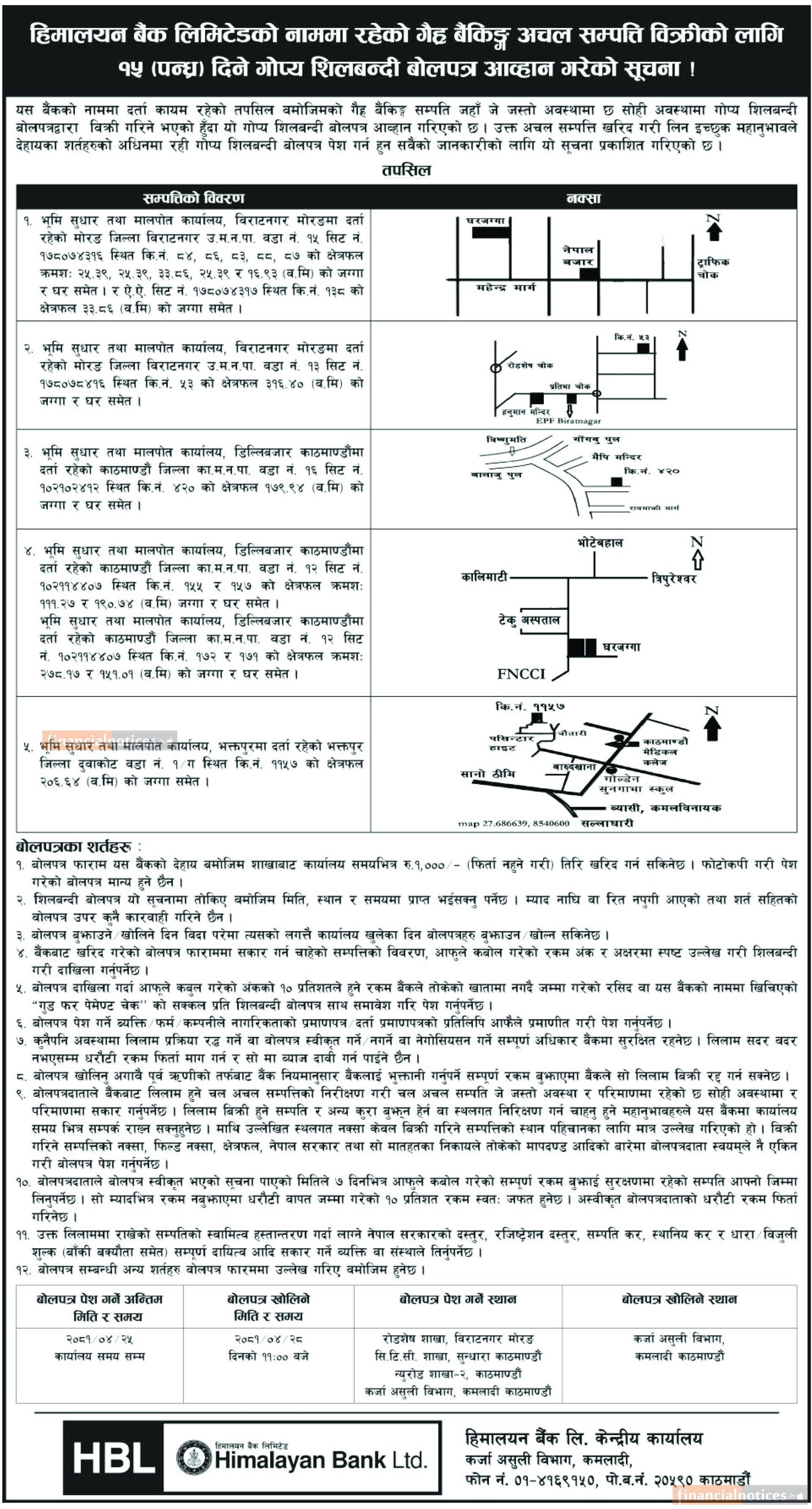 गैह्र बैंकिङ्ग अचल सम्पत्ति बिक्रीको लागि १५ दिने गोप्य शिलबन्दी बोलपत्र आव्हान गरेको सूचना