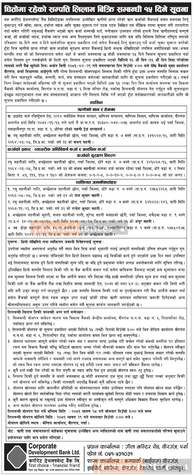 धितोमा रहेको सम्पत्ति लिलाम बिक्री सम्बन्धी १५ दिने सूचना