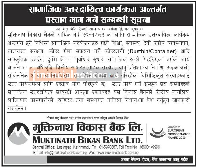 सामाजिक उत्तरदायित्व कार्यक्रम अन्तर्गत प्रस्ताव माग गर्ने सम्बन्धी सूचना