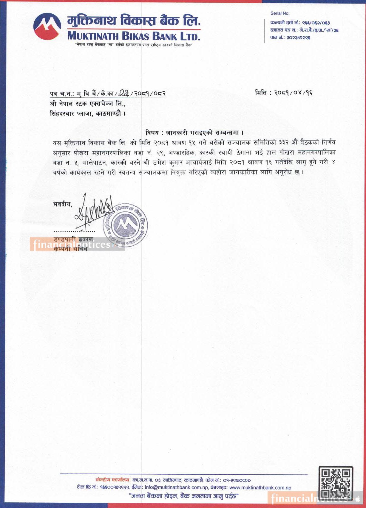 Notice Regarding Appointment of Independent Director of Muktinath Bikas Bank