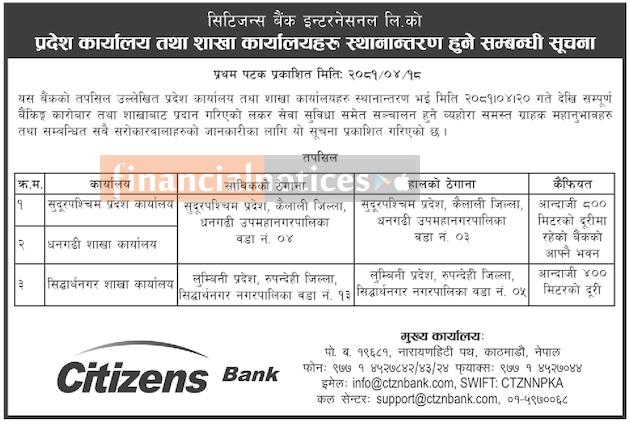 प्रदेश कार्यालय तथा शाखा कार्यालयहरु स्थानान्तरण हुने सम्बन्धी सूचना