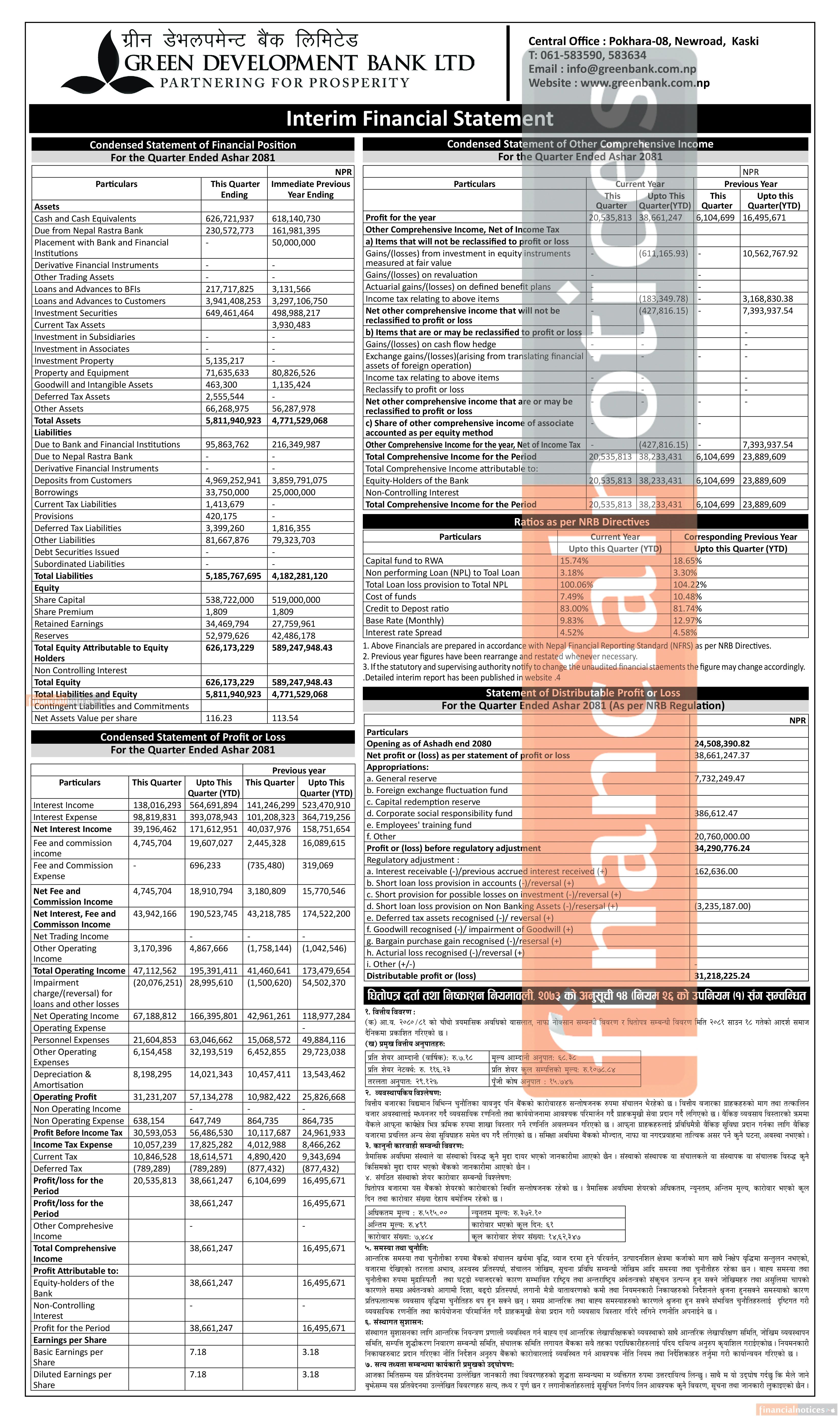 ग्रीन डेभलपमेन्ट बैंकले २०८०/८१ आर्थिक वर्षको चौथो त्रैमाससम्मको अपरिष्कृत वित्तीय विवरण प्रकाशित गरेको सूचना प्रकाशित गरेको छ । विवरण अनुसार बैंकको खुद नाफा अघिल्लो आर्थिक वर्षको सोही अवधिको तुलनामा बढेको छ। गत आर्थिक वर्षको असार मसान्तसम्ममा बैंकले ३ करोड ८६ लाख रुपैयाँ खुद नाफा आर्जन गरेको छ। अघिल्लो आर्थिक वर्षको सोही अवधिसम्ममा बैंकले १ करोड ६४ लाख रुपैयाँ खुद नाफा कमाएको थियो। बैंकको खराब कर्जा सामान्य अंकले घटेको छ । गत आर्थिकवर्षको असार मसान्तसम्म बैंकको खराब कर्जा ३.१८ प्रतिशत रहेको छ । अघिल्लो आर्थिक वर्षको सोह अवधिमा ३.३० प्रतिशत रहेको थियो ।